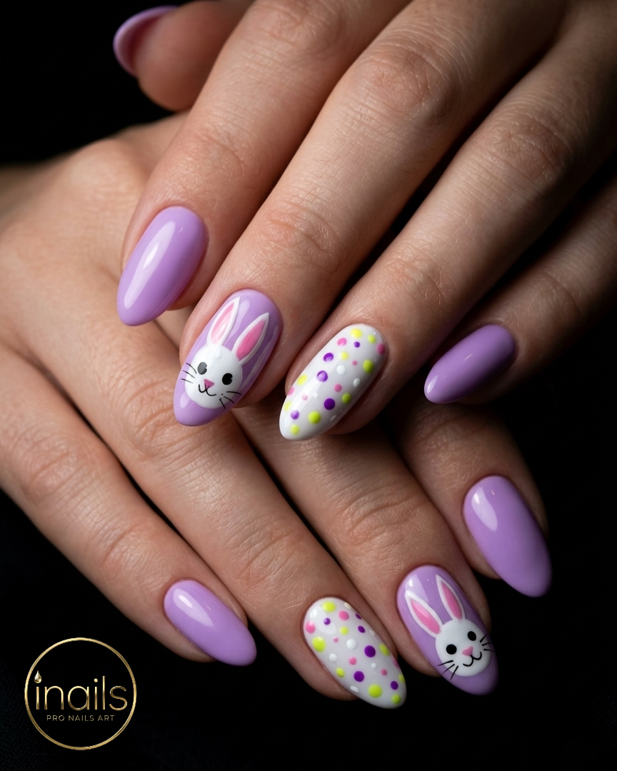First up, we have this absolutely adorable combination of elegant lavender, playful polka dots, and classic Easter bunnies. The soft purple provides a sophisticated base, while the accent nails bring in a youthful charm. This design perfectly captures the spirit of Easter with a touch of modern elegance. It's an ideal choice for anyone looking for pretty and unique Easter nails.