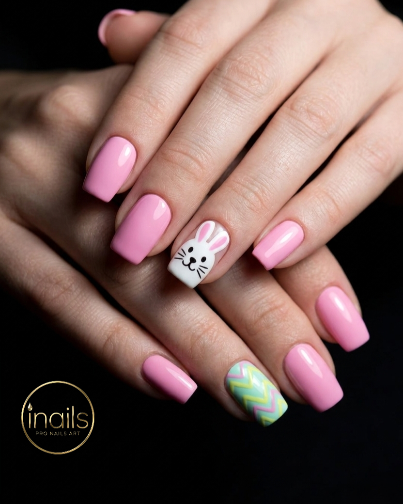 For those who love a touch of simplicity with their festive flair, consider this chic pink design featuring a charming bunny accent nail and a subtle geometric pattern. The clean lines of the solid pink provide a timeless backdrop, while the accent nails add that special Easter touch without being overwhelming. It's a fantastic option for stylish nail art that's both festive and refined.