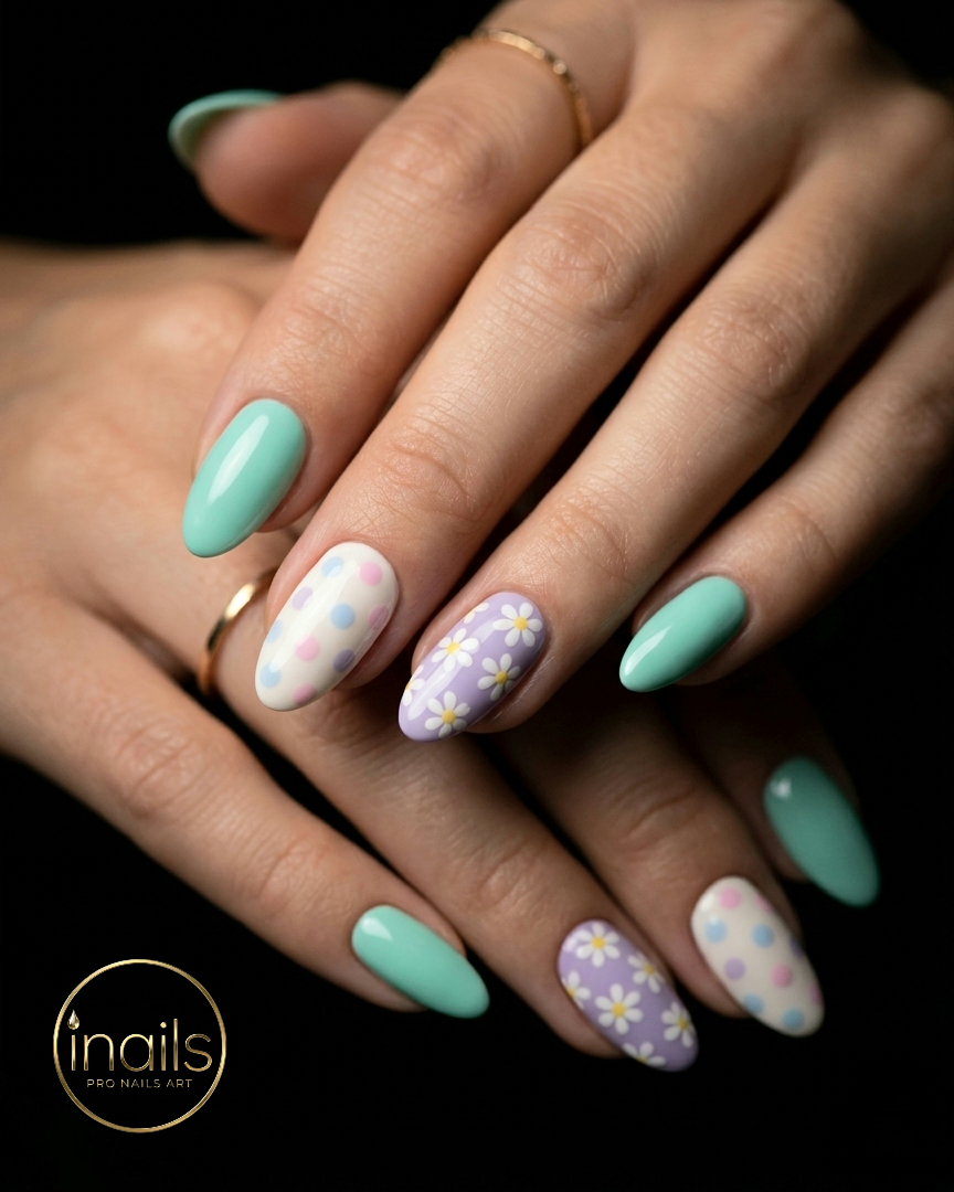 Embrace the freshness of spring with this stunning mint green manicure adorned with delicate polka dots and sweet daisy flowers. The cool mint green is incredibly refreshing, evoking images of new growth and sunny days. The tiny daisies on a lilac background add a beautiful floral element, making this design perfect for welcoming spring and Easter with open arms. It's a gorgeous take on floral nails.