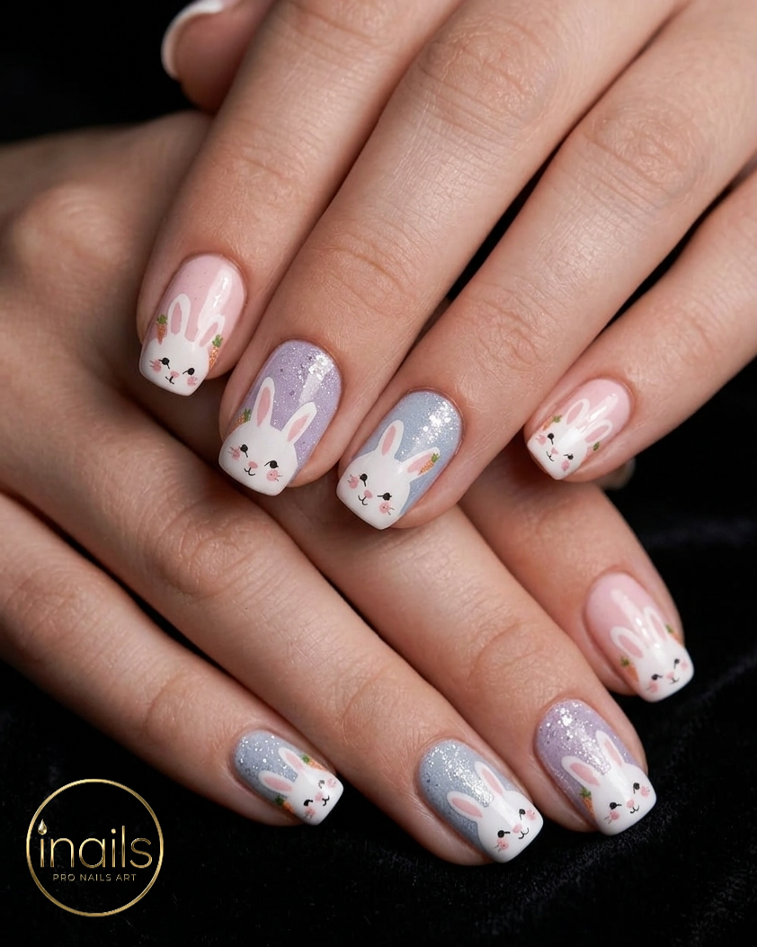 Finally, get ready to sparkle with these playful bunny designs featuring subtle glitter accents. With bunnies in various poses and colors, this design is full of personality. The square shape adds a modern edge, while the glitter infused pastel shades ensure your Easter nails shimmer with every movement. It’s a truly whimsical and sparkling option for your holiday nail art.